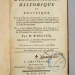 A French translation of William Wallace’s influential examination of population in the ancient world, printed in 1769. The work enters directly into one of the century’s most animated debates: whether modern societies had declined or advanced in demographic strength compared with classical antiquity.