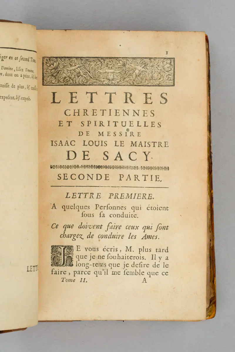 A seventeenth-century Paris printing of the spiritual letters of Isaac-Louis Le Maistre de Sacy, one of the central figures of the Port-Royal movement and a major voice in French religious life. Works of this nature circulated widely among clergy and educated lay readers, shaping devotional practice well beyond their original community.