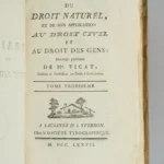 Natural law theory lay at the centre of eighteenth-century debates on sovereignty, rights, and international order. Vicat’s synthesis forms part of the intellectual current that fed directly into later revolutionary and constitutional thinking. Multi-volume survivals from Swiss presses of this period are steadily becoming less available on the market.