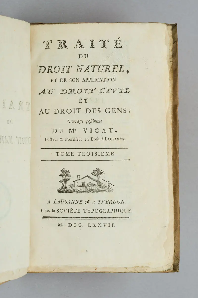 Vicat, Pierre. Traité du droit naturel, & de l’application de ses principes au droit civil et au droit des gens. A Lausanne: Chez la Société Typographique; et à Yverdon, Chez la Société Litt. et Typogr., 1777.